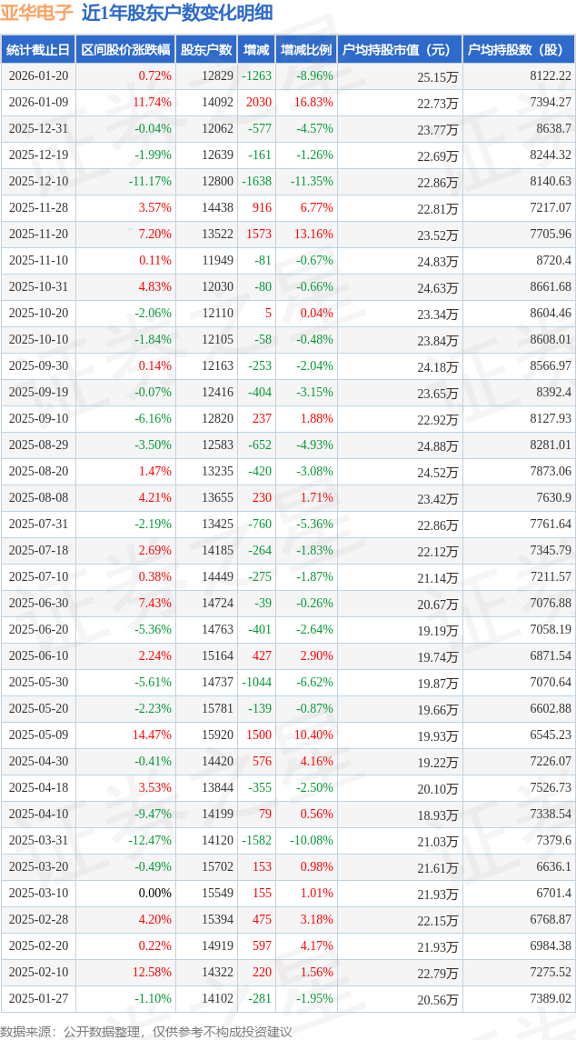 证券之星消息,近日亚华电子披露,截至2026年1月20日公司股东户数为1.28万户,较1月9日减少1263.0户,减幅为8.96%。户均持股数量由上期的7394.0股增加至8122.0股,户均持股市值为25.15万元。