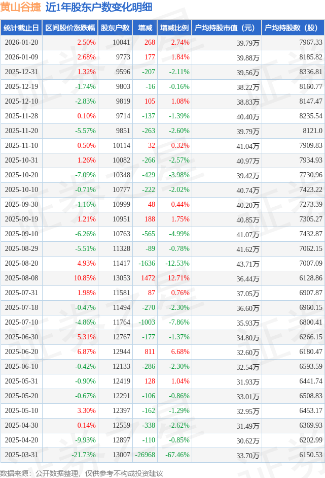 从股价来看,2026年1月9日至2026年1月20日,黄山谷捷区间涨幅为2.5%,在此期间股东户数增加268.0户,增幅为2.74%。