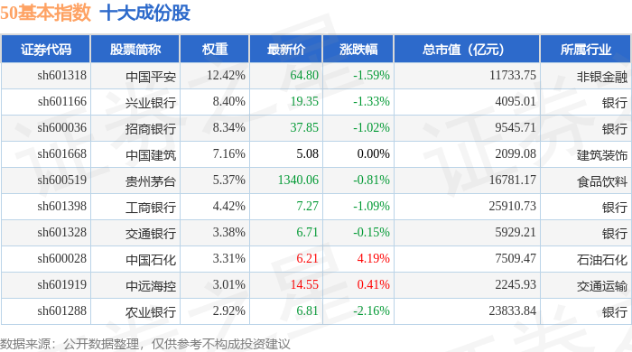 50基本(000052)指数十大成份股详情如下: