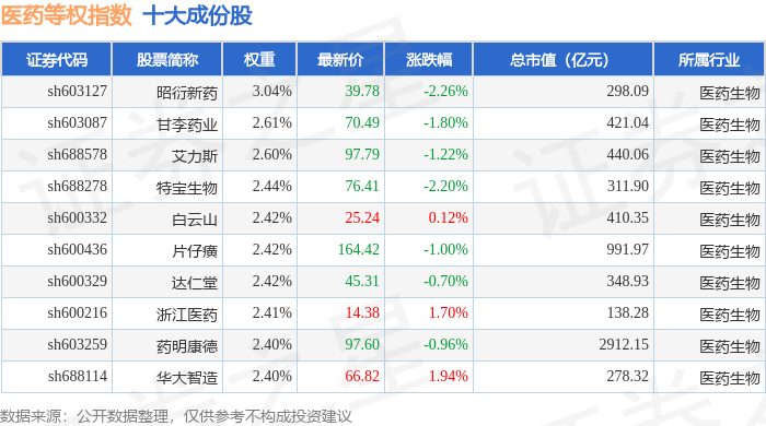 医药等权(000075)指数十大成份股详情如下: