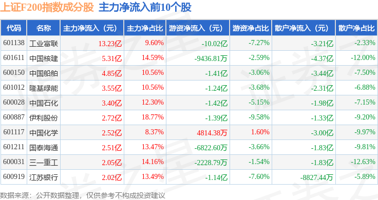 资金流向方面,上证F200(000098)指数成份股当日主力资金净流出合计46.94亿元,游资资金净流入合计8.56亿元,散户资金净流入合计38.38亿元。成份股资金流向详情见下表: