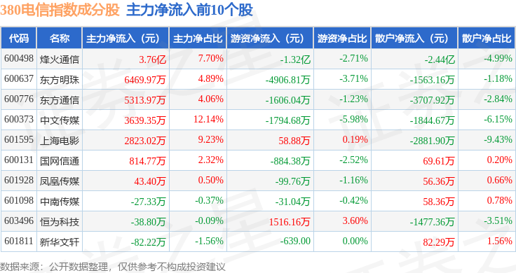 资金流向方面,380电信(000112)指数成份股当日主力资金净流出合计7.23亿元,游资资金净流入合计2.29亿元,散户资金净流入合计4.94亿元。成份股资金流向详情见下表: