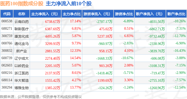 资金流向方面,医药100(000978)指数成份股当日主力资金净流出合计22.75亿元,游资资金净流入合计4.1亿元,散户资金净流入合计18.22亿元。成份股资金流向详情见下表: