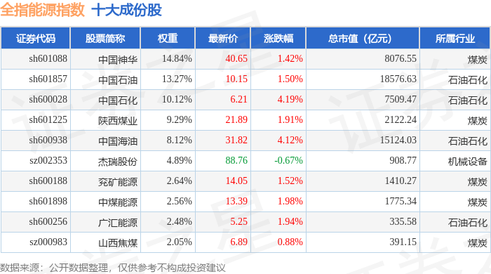全指能源(000986)指数十大成份股详情如下: