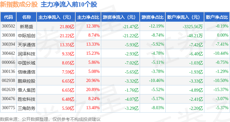 资金流向方面,新指数(399100)成份股当日主力资金净流出合计113.2亿元,游资资金净流出合计75.72亿元,散户资金净流入合计188.92亿元。成份股资金流向详情见下表: