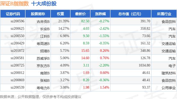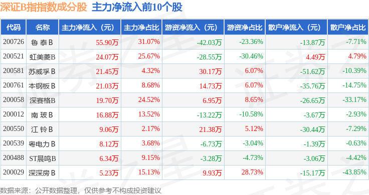 资金流向方面,深证B指(399108)指数成份股当日主力资金净流出合计1249.63万元,游资资金净流入合计251.73万元,散户资金净流入合计997.9万元。成份股资金流向详情见下表: