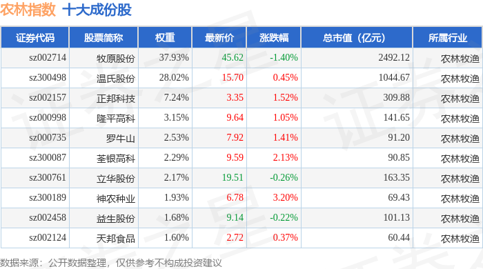 农林指数(399231)十大成份股详情如下: