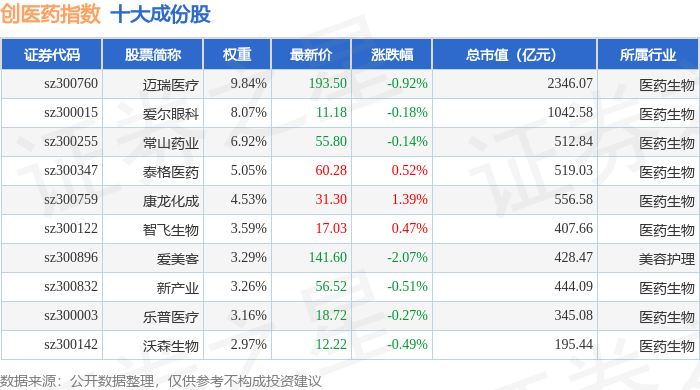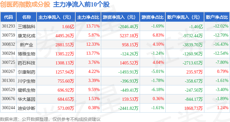 资金流向方面,创医药(399275)指数成份股当日主力资金净流出合计6.05亿元,游资资金净流入合计2.2亿元,散户资金净流入合计3.85亿元。成份股资金流向详情见下表: