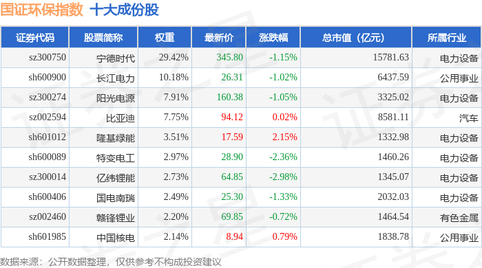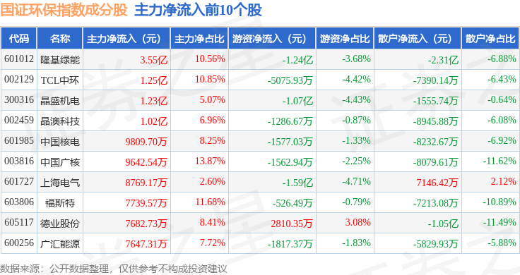 资金流向方面,国证环保(399358)指数成份股当日主力资金净流出合计52.33亿元,游资资金净流入合计4.6亿元,散户资金净流入合计47.73亿元。成份股资金流向详情见下表: