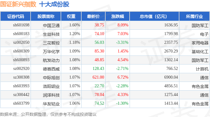 证券之星消息,1月22日,国证新兴(399392)指数报收于3161.81点,涨0.23%,成交4085.35亿元,换手率1.45%。当日该指数成份股中,上涨的有47家,鹏鼎控股以10.0%的涨幅领涨,下跌的有51家,长电科技以6.1%的跌幅领跌。