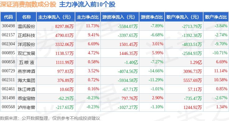 资金流向方面,深证消费(399617)指数成份股当日主力资金净流出合计1.49亿元,游资资金净流出合计3.97亿元,散户资金净流入合计5.46亿元。成份股资金流向详情见下表: