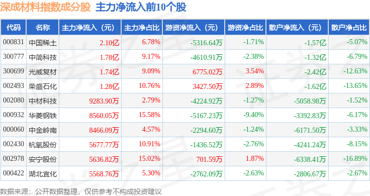资金流向方面,深成材料(399681)指数成份股当日主力资金净流出合计14.71亿元,游资资金净流入合计8.84亿元,散户资金净流入合计5.87亿元。成份股资金流向详情见下表: