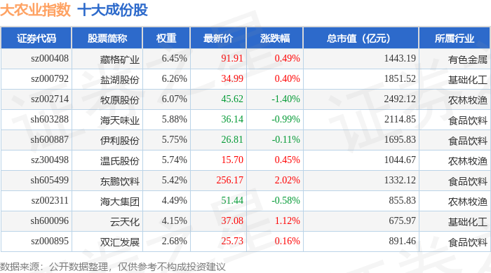 大农业(399814)指数十大成份股详情如下: