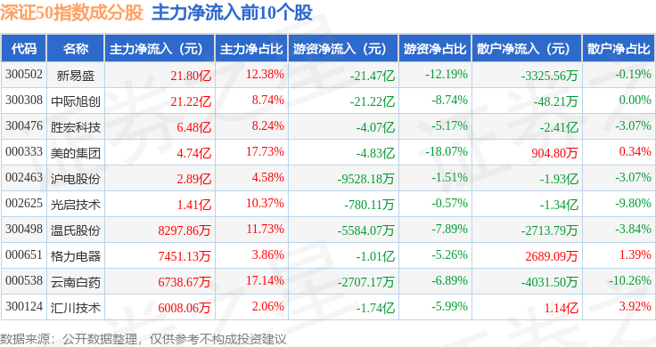 资金流向方面,深证50(399850)指数成份股当日主力资金净流出合计3540.38万元,游资资金净流出合计46.18亿元,散户资金净流入合计46.53亿元。成份股资金流向详情见下表: