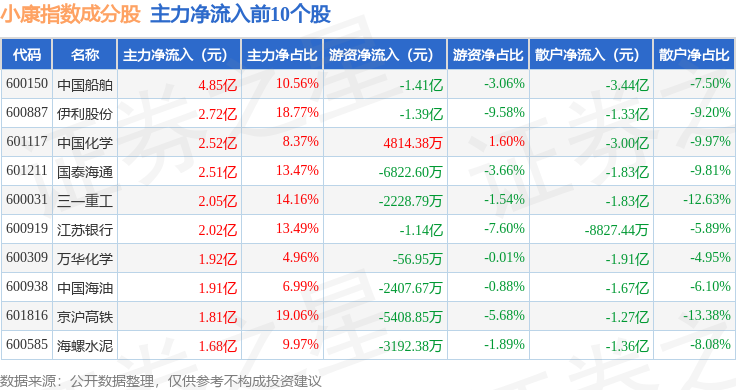 资金流向方面,小康指数(399901)成份股当日主力资金净流出合计37.29亿元,游资资金净流入合计33.78亿元,散户资金净流入合计3.51亿元。成份股资金流向详情见下表: