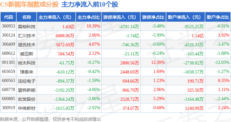 资金流向方面,CS新能车(399976)指数成份股当日主力资金净流出合计81.05亿元,游资资金净流入合计12.06亿元,散户资金净流入合计68.81亿元。成份股资金流向详情见下表: