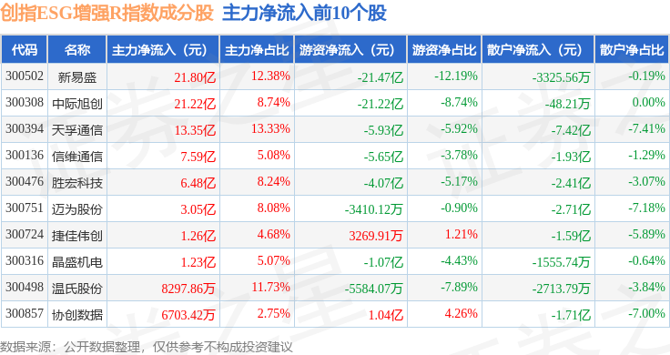 资金流向方面,创指ESG增强R(470034)指数成份股当日主力资金净流入合计30.39亿元,游资资金净流出合计51.78亿元,散户资金净流入合计21.39亿元。成份股资金流向详情见下表: