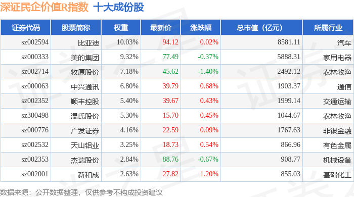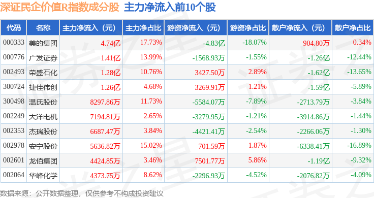 资金流向方面,深证民企价值R(470072)指数成份股当日主力资金净流入合计1.18亿元,游资资金净流出合计6.01亿元,散户资金净流入合计4.82亿元。成份股资金流向详情见下表: