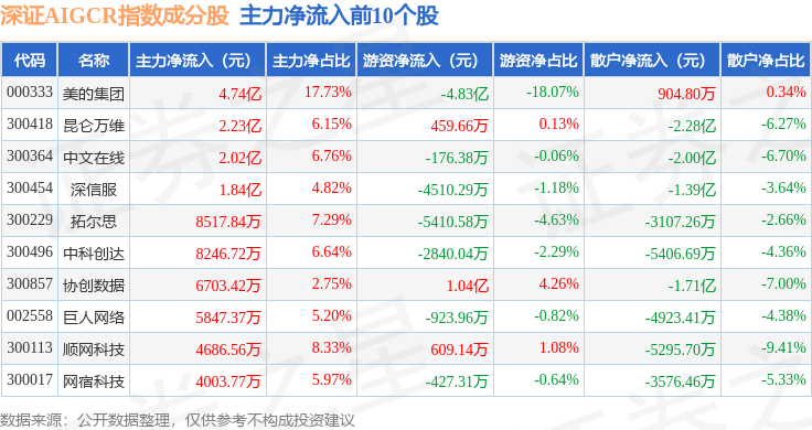 资金流向方面,深证AIGCR(470075)指数成份股当日主力资金净流出合计2.12亿元,游资资金净流出合计2.09亿元,散户资金净流入合计4.21亿元。成份股资金流向详情见下表: