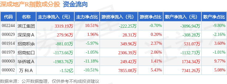 资金流向方面,深成地产R(471001)指数成份股当日主力资金净流出合计1.56亿元,游资资金净流入合计1.06亿元,散户资金净流入合计5068.72万元。成份股资金流向详情见下表:
