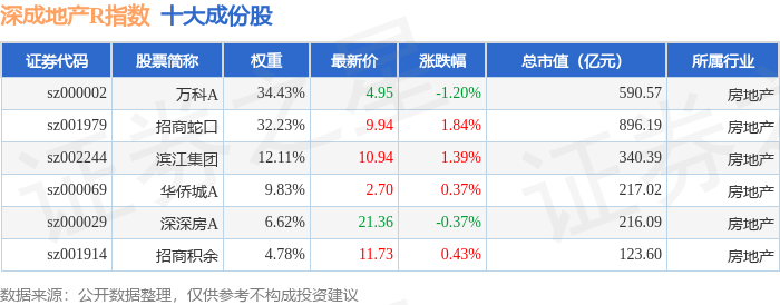 证券之星消息,1月22日,深成地产R(471001)指数报收于657.94点,涨0.41%,成交33.49亿元,换手率1.75%。当日该指数成份股中,上涨的有4家,招商蛇口以1.84%的涨幅领涨,下跌的有2家,万科A以1.2%的跌幅领跌。
