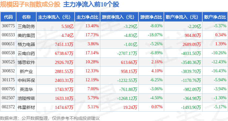 资金流向方面,规模因子R(480055)指数成份股当日主力资金净流入合计7.83亿元,游资资金净流出合计11.33亿元,散户资金净流入合计3.5亿元。成份股资金流向详情见下表: