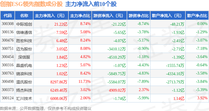 资金流向方面,创指ESG领先(970031)指数成份股当日主力资金净流出合计8.46亿元,游资资金净流出合计24.65亿元,散户资金净流入合计33.11亿元。成份股资金流向详情见下表: