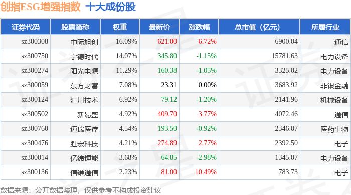 创指ESG增强(970034)指数十大成份股详情如下: