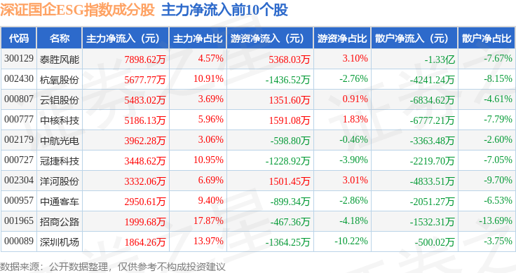 资金流向方面,深证国企ESG(970055)指数成份股当日主力资金净流出合计22.17亿元,游资资金净流入合计1.11亿元,散户资金净流入合计21.06亿元。成份股资金流向详情见下表: