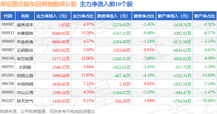 资金流向方面,深证国企股东回报(970064)指数成份股当日主力资金净流出合计8.72亿元,游资资金净流出合计2.77亿元,散户资金净流入合计11.49亿元。成份股资金流向详情见下表: