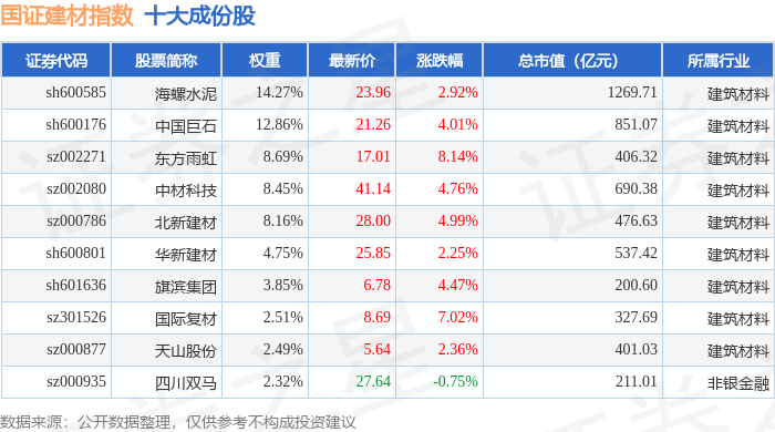 国证建材(980048)指数十大成份股详情如下: