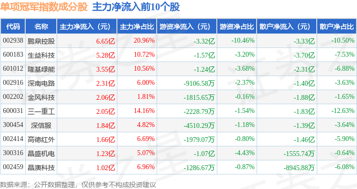 资金流向方面,单项冠军(980150)指数成份股当日主力资金净流出合计73.98亿元,游资资金净流入合计17.02亿元,散户资金净流入合计56.96亿元。成份股资金流向详情见下表: