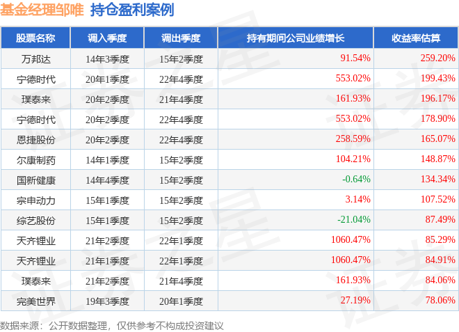 邹唯管理的嘉实主题混合基金在14年3季度买入万邦达,在持有3个季度后在15年2季度卖出。持有期间的估算收益率为259.2%,持有期间万邦达在2014年到2015年的年报营业总收入增幅达91.54%。