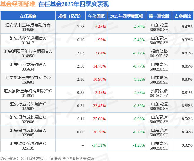证券之星消息,截止2025年四季度末,基金经理邹唯旗下共管理10只基金,本季度表现最佳的为汇安行业龙头混合A(005634),季度净值跌0.77%。