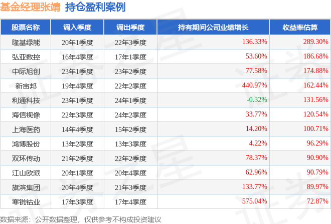 张靖管理的景顺长城策略精选灵活配置混合A基金在20年1季度买入隆基绿能,在持有2年又2个季度后在22年3季度卖出。持有期间的估算收益率为289.3%,持有期间隆基绿能在2020年到2022年的年报营业总收入增幅达136.33%。