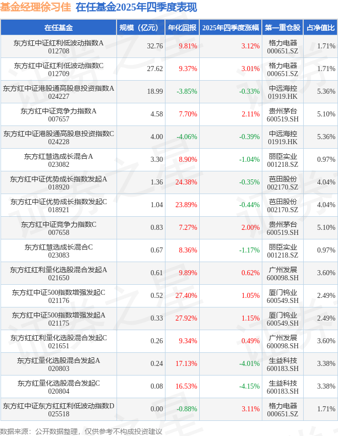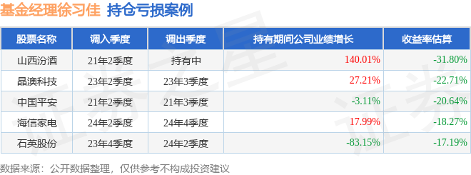 徐习佳管理的东方红中证竞争力指数A基金在21年2季度买入山西汾酒,已连续持有4年又2个季度。持有期间的估算收益率为-31.8%,持有期间山西汾酒在2021年到2025年的中报归属净利润增幅达140.01%。