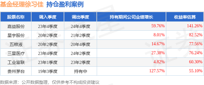 徐习佳管理的东方红中证优势成长指数发起A基金在23年4季度买入嘉益股份,在持有1年又0个季度后在24年4季度卖出。持有期间的估算收益率为141.26%,持有期间嘉益股份在2023年到2024年的年报营业总收入增幅达59.76%。