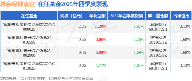 证券之星消息,截止2025年四季度末,基金经理袁宜旗下共管理4只基金,本季度表现最佳的为富国宏观策略灵活配置混合A(000029),季度净值跌1.67%。