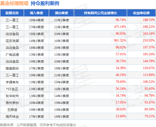 程琨管理的广发核心精选混合基金在18年4季度买入三一重工,在持有2年又2个季度后在21年2季度卖出。持有期间的估算收益率为248.53%,持有期间三一重工在2018年到2021年的年报归属净利润增幅达96.74%。