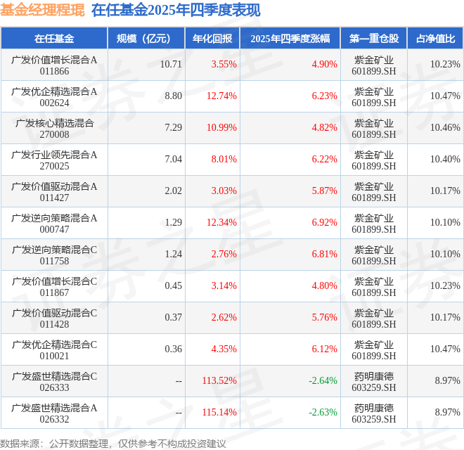 程琨管理的广发价值增长混合A基金在21年3季度买入紫金矿业,已连续持有4年又1个季度。持有期间的估算收益率为-79.22%,持有期间紫金矿业在2021年到2025年的中报归属净利润增幅达250.3%。