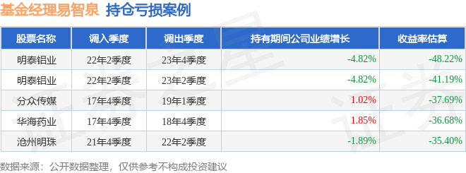 易智泉管理的富国兴泉回报12个月持有期混合A基金在22年2季度买入明泰铝业,在持有1年又2个季度后在23年4季度卖出。持有期间的估算收益率为-48.22%,持有期间明泰铝业在2022年到2023年的年报营业总收入降幅为4.82%。
