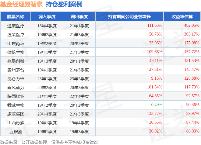易智泉管理的富国臻选成长灵活配置混合A基金在18年4季度买入通策医疗,在持有2年又1个季度后在21年1季度卖出。持有期间的估算收益率为482.05%,持有期间通策医疗在2018年到2021年的年报归属净利润增幅达111.63%。