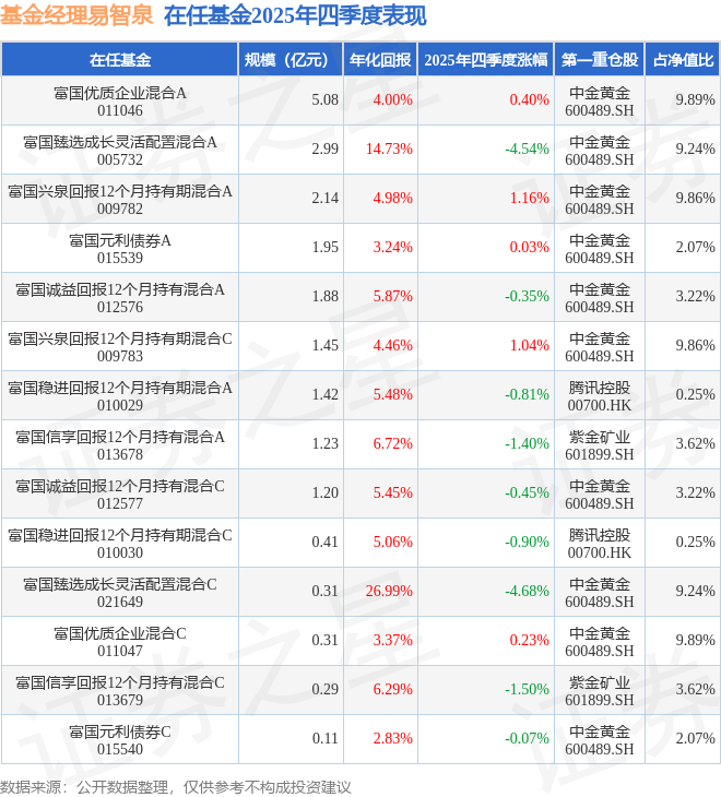 证券之星消息,截止2025年四季度末,基金经理易智泉旗下共管理14只基金,本季度表现最佳的为富国兴泉回报12个月持有期混合A(009782),季度净值涨1.16%。
