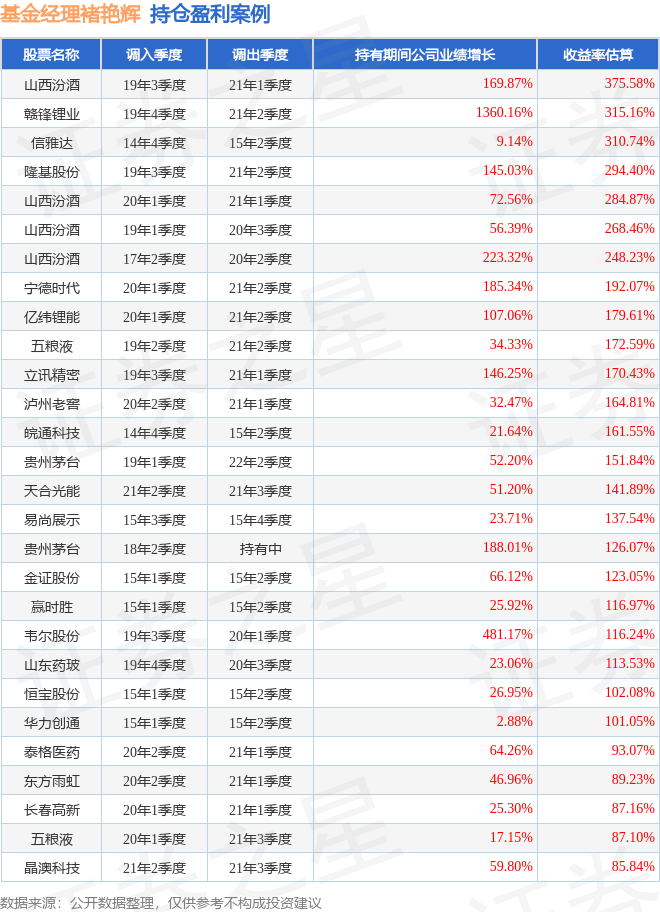 褚艳辉管理的浦银盛世A基金在19年3季度买入山西汾酒,在持有1年又2个季度后在21年1季度卖出。持有期间的估算收益率为375.58%,持有期间山西汾酒在2019年到2021年的年报归属净利润增幅达169.87%。