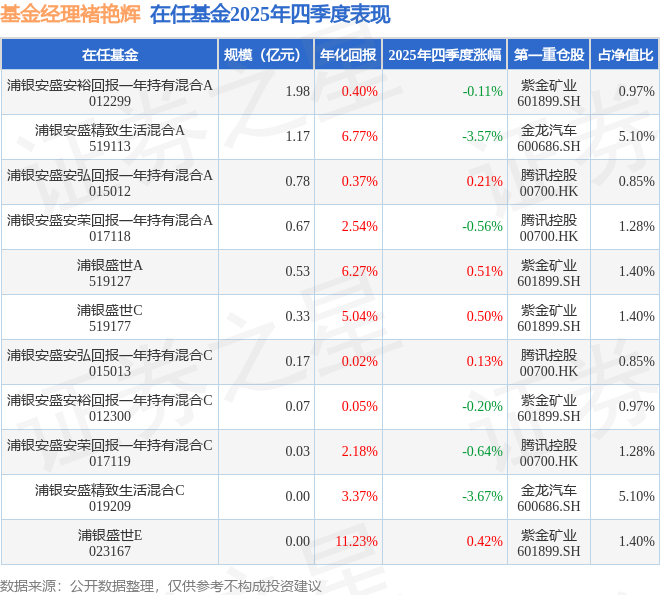 褚艳辉管理的浦银安恒回报定开混合A基金在24年1季度买入紫金矿业,在持有2个季度后在24年3季度卖出。持有期间的估算收益率为-87.8%,持有期间紫金矿业在2023年到2024年的年报归属净利润增幅达51.76%。