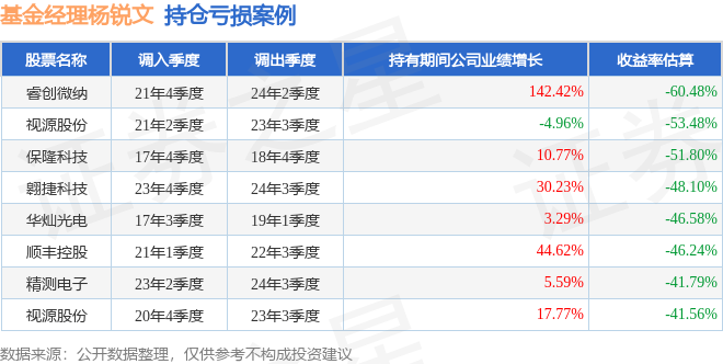 杨锐文管理的景顺长城公司治理混合基金在21年4季度买入睿创微纳,在持有2年又2个季度后在24年2季度卖出。持有期间的估算收益率为-60.48%,持有期间睿创微纳在2021年到2024年的年报营业总收入增幅达142.42%。