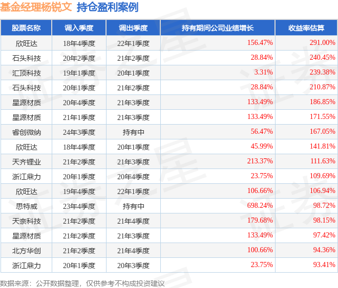 杨锐文管理的景顺长城环保优势股票基金在18年4季度买入欣旺达,在持有3年又1个季度后在22年1季度卖出。持有期间的估算收益率为291%,持有期间欣旺达在2018年到2022年的年报营业总收入增幅达156.47%。