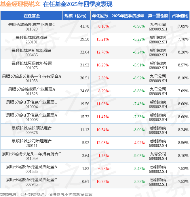 证券之星消息,截止2025年四季度末,基金经理杨锐文旗下共管理13只基金,本季度表现最佳的为景顺长城公司治理混合(260111),季度净值涨4.92%。