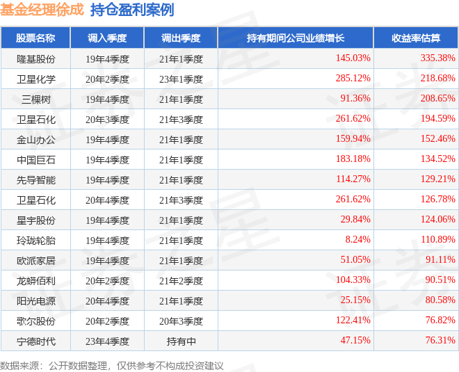 徐成管理的国富大中华精选混合基金在19年4季度买入隆基股份,在持有1年又1个季度后在21年1季度卖出。持有期间的估算收益率为335.38%,持有期间隆基股份在2019年到2021年的年报营业总收入增幅达145.03%。