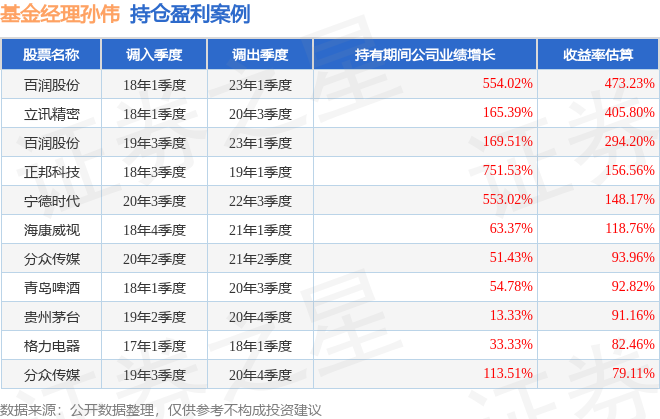 孙伟管理的东方红睿满LOF基金在18年1季度买入百润股份,在持有5年又0个季度后在23年1季度卖出。持有期间的估算收益率为473.23%,持有期间百润股份在2018年到2023年的年报归属净利润增幅达554.02%。